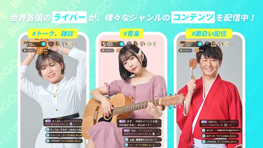 🎭 多彩なコンテンツ: 音楽、ダンス、ゲーム、トークショーなど、さまざまなジャンルのライブ配信を楽しむことができます。