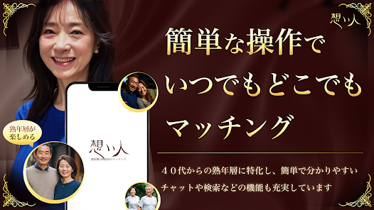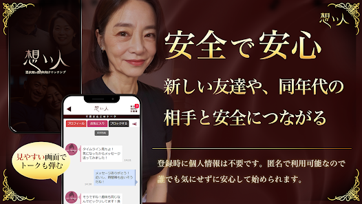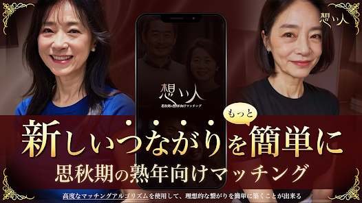 📱💞思秋期の熟年向けマッチングアプリ、想い人は合同会社ファーストが開発した、同世代の方々との出会いを求める熟年のためのアプリです。🌟このアプリの特徴は、安全性と使いやすさに重点を置いています。同世代の方々との出会いや交流を楽しむことができる、心温まるコミュニティを提供しています。💬なぜこのアプリを選ぶのか?その理由は、同年代特有の悩みや趣味を共有できる相手を見つけやすく、安心して使える環境が整っているからです。🌈利用者の体験談や開発者の情熱も感じられ、使うほどにその魅力が増していきます。📲このアプリをダウンロードして、新しい出会いの第一歩を踏み出しましょう!🎉