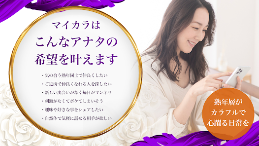 🌟総合紹介🌟熟年層に特化した出会いと交流の場を提供する『MyColor(マイカラ)』は、同年代の人々との新たなつながりを求めるユーザーに最適なアプリです。👫開発者である合同会社クリエイティブは、アクティブシニアの社会参加と豊かな生活を応援することを理念に、使い勝手の良いインターフェイスを追求しました。💡利用経験から、このアプリは直感的に理解しやすく、登録から始めるまでのプロセスがスムーズです。似たようなアプリが多い中で、MyColorはセキュリティやプライバシーへの配慮が行き届いており、熟年層にとって安心して利用できる環境が整っています。🔒他アプリと比較しても、その熟年層専用のサービスと機能がユーザーを惹きつけています。さあ、豊かなシニアライフを始める一歩として『MyColor』のダウンロードをお勧めします!📲